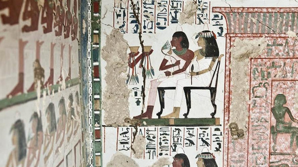 A handout picture released by the Egyptian antiquities authorities on March 10, 2015 shows the inside of a tomb belonging to Sa-Mut that was discovered by the American Research Center’s (ARCE) mission led with the Egyptian Ministry of Antiquities during the excavation works at the open courtyard of the tomb TT110 at a vast necropolis of more than 500 pharaonic tombs, situated at the feet of the Theban mountains, between the famed valleys of the Kings and Queens over the town of al-Qurna. The tomb most probably dates to the 18th Dynasty of the New Kingdom. AFP PHOTO / SCA / AYMAN DAMARNY