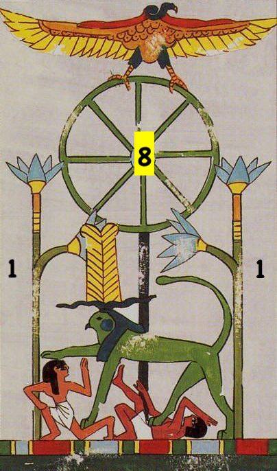 The Sphinx remains in perfect equilibrium as if the constantly revolving wheel of fortune had no influence over him. He thus symbolizes the mysterious power of God disposing of human destinies according to the good or bad actions of everyone.