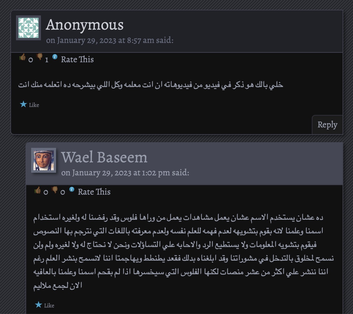 • ده عشان يستخدم الاسم عشان يعمل مشاهدات يعمل من وراها فلوس وقد رفضنا له ولغيره استخدام اسمنا وعلمنا لانه بقوم بتشويهه لعدم فهمه للعلم نفسه ولعدم معرفته باللغات التي نترجم بها النصوص فيقوم بتشويه المعلومات ولا يستطيع الرد والاحابه علي التساؤلات ونحن لا نحتاج له ولا لغيره ولم ولن نسمح لمخلوق بالتدخل في مشوراتنا وقد ابلغناه بدلك فقعد يطنطط ويهاجمتا اننا لانسمح بنشر العلم رغم اننا ننشر علي اكثر من عشر منصات لكنها الفلوس التي سيخسرها اذا لم بقحم اسمنا وعلمنا بالعافيه الان لجمع ملاليم