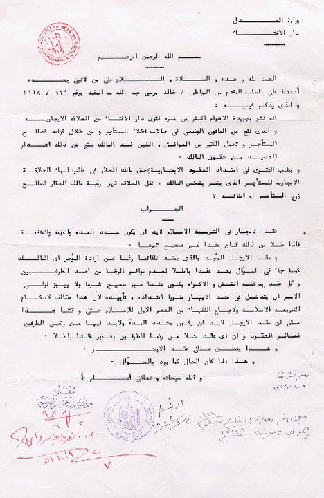 “عقد الإيجار فى الشريعة الإسلام لابد أن يكون محدد المدة والقيمة والمنفعة فإذا خلا من ذلك كان عقدا غير صحيح شرعا” “وعقد الإيجار المؤبد والذي يمتد تلقائيا رغما عن إرادة المؤجر أي المالك كما جاء فى السؤال يعد عقدا باطلا لعدم توافر الرضا من أحد الطرفين وكل عقد يداخله الغش والإكراه يكون عقدا غير صحيح شرعا ولا يجوز لولى الأمر أن يتدخل فى عقد الإيجار مقررا امتداده وتأبيده لأن هذا مخالف لأحكام الشريعة الإسلامية ولإجماع الفقهاء من العصر الأول للإسلام حتى وقتنا هذا على أن عقد الإيجار يجب أن يكون محدد المدة ولابد فيها من رضى الطرفين كسائر العقود وأن أى عقد خلا من رضا الطرفين يعتبر عقدا باطلا “. “وهذا ينطبق على عقد الإيجار” “وهذا اذا كان الحال كما ورد بالسؤال” “والله سبحانه وتعالى أعلم ؛ مفتى جمهورية مصر العربية “
