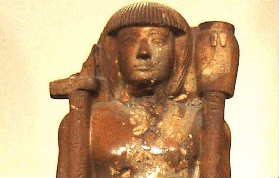 43. A seated figure of Osiris wearing the White and Red Crowns.