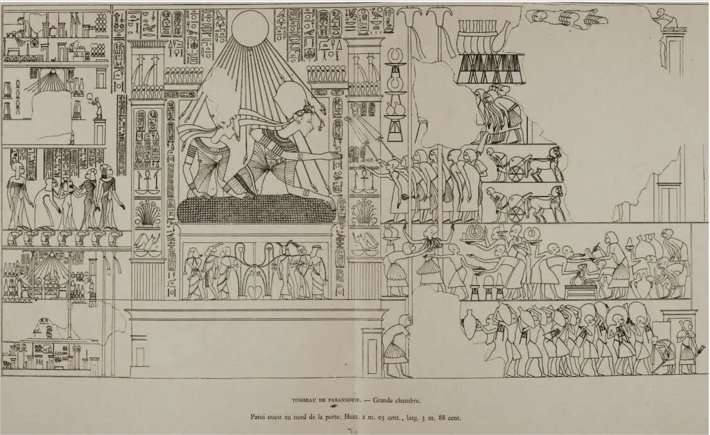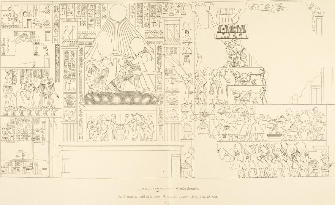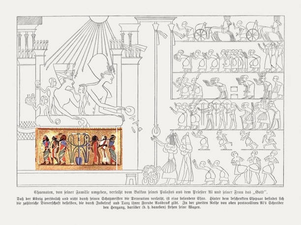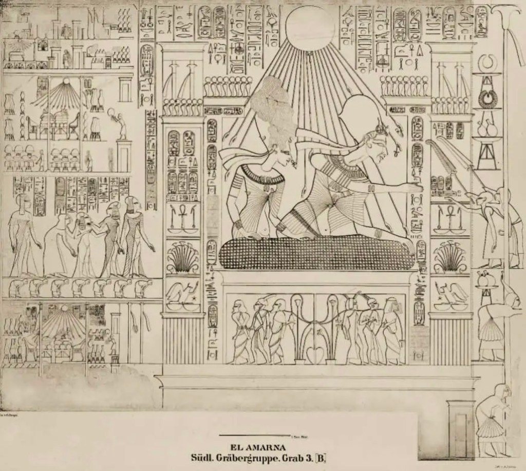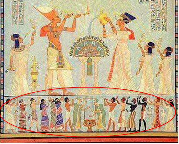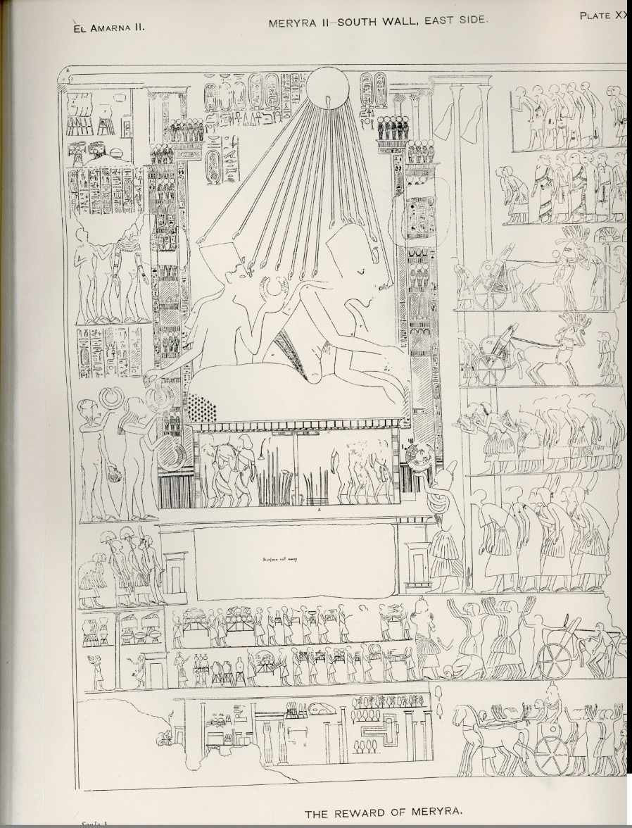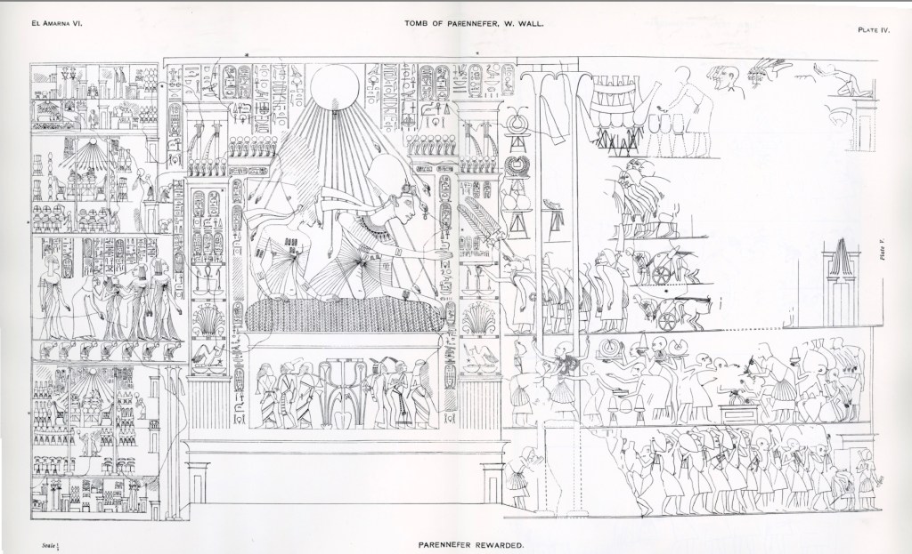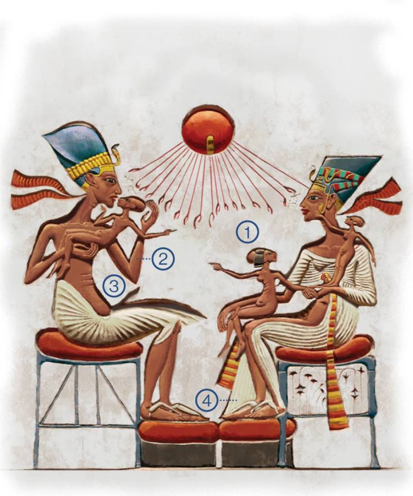 047 bcb 11The Egyptian pharaoh Akhenaten (18th dynasty) and his family on the balcony of his palace. The pharaoh submit gifts the priest Ai and his wife. Wood engraving, published in 1879.Screenshot