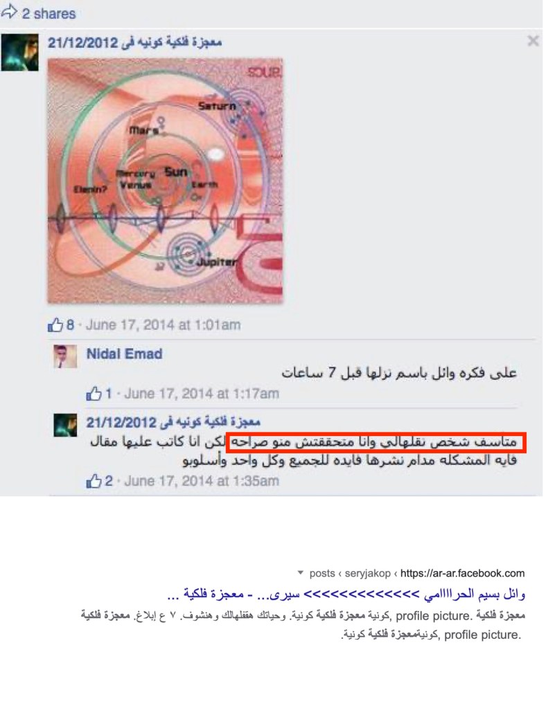 ابن الحراميه سيري يعقوب صاحب صفحه معجزه فلكيه يسرق المنشور من صفحتنا ، ثم ينشر يقول وائل سارق المنشور منه ، ثم يتم مواجهته من قبل اتباع صفحته ان وائل منزل المنشور قبل ما الحرامي سيري يعقوب ينشره، وان صفحته المعجزه الفلكيه قامت بنشر المنشور المسروق بعد نشره من قبل وائل ، بل واتهام وائل صاحب المنشور الاصلي ، اتهامه بالسرقه، يعني حرامي ابن حراميه وبجح كمان عشان عند مواجهته انه هو من قام بسرقه المنشور اعتذر وقال ده علم واي حد ينشره ، هكذا ارتكب ذنب بسيط الا وهو السرقه، وهكذا كفر بالله العظيم انه حلل السرقه لنفسه تحت اي عذر من الاف الاعذار التي نسمعها يوميا من حراميه لايقلوا عنه عنه بجاحه واجرام وكفر ونفاق