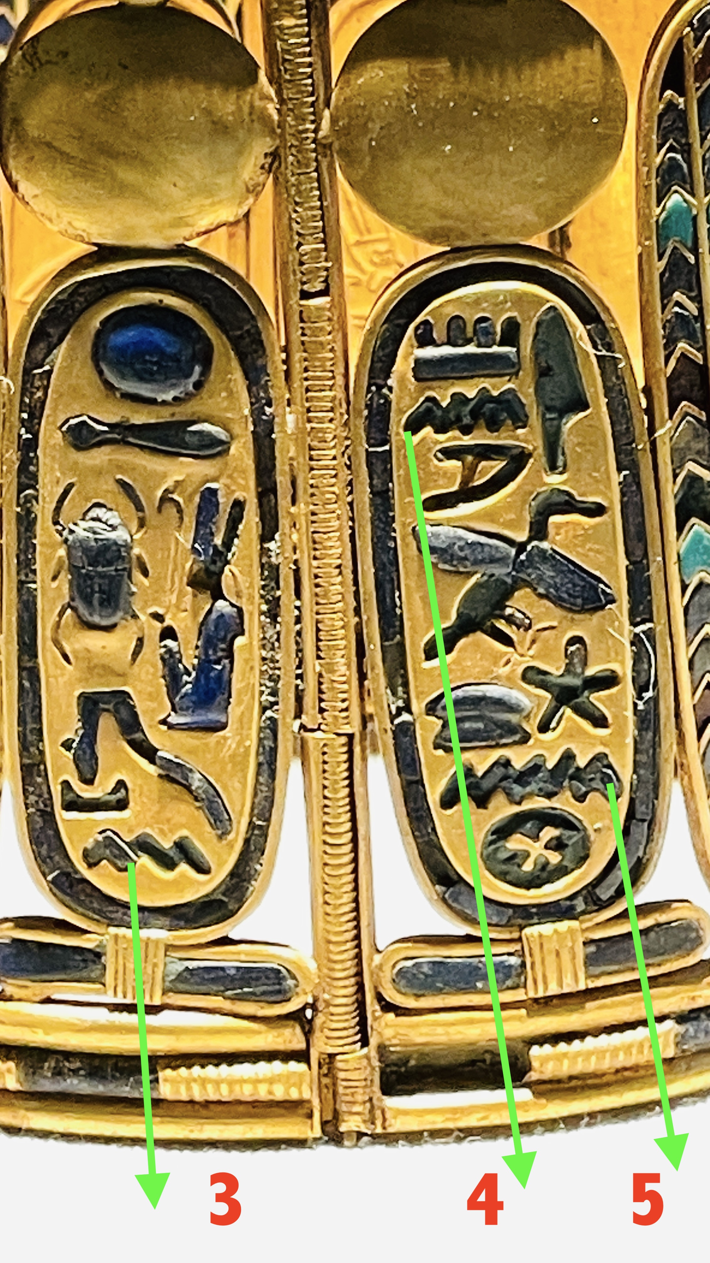 5. The goddess Maat, wearing the feather of Truth and holding the symbol of “life.” 6. An Utchat, or Eye of Horus or Ra.